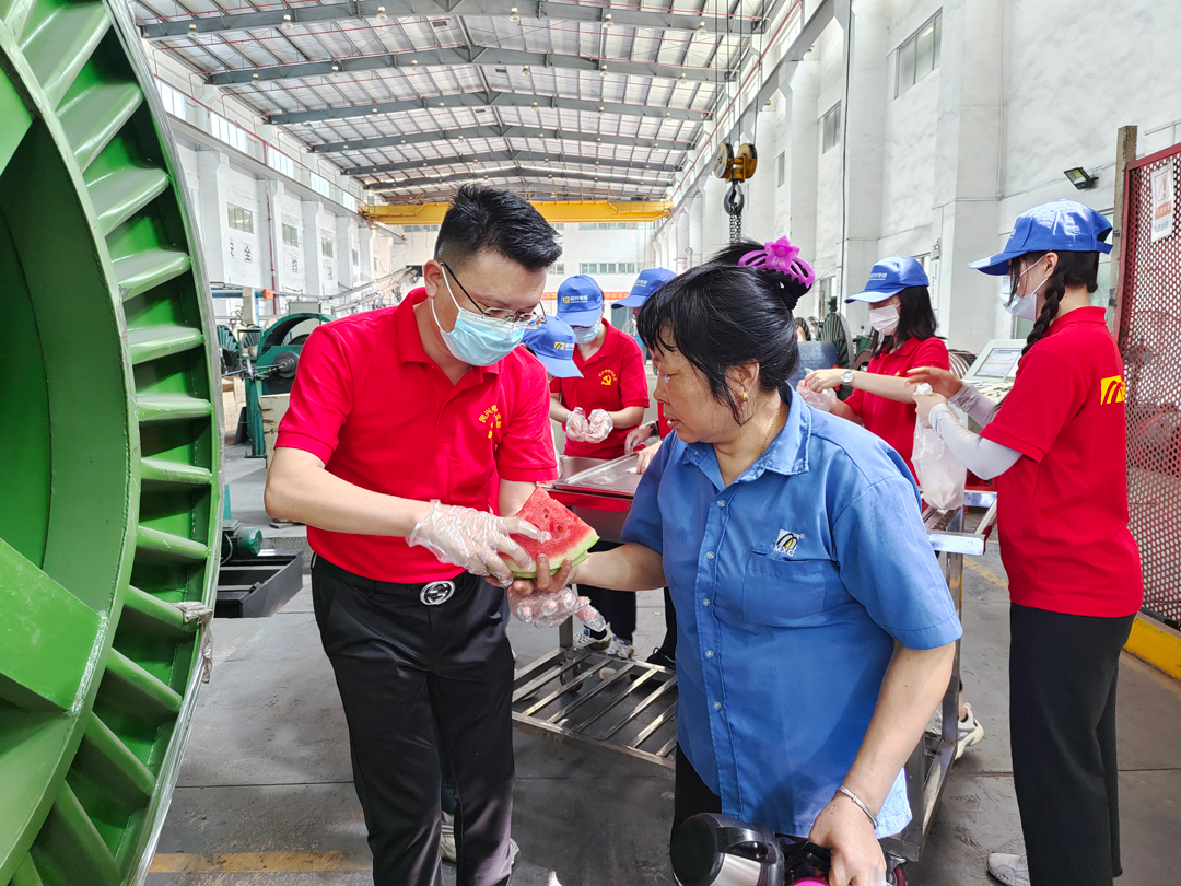 當(dāng)日下午2點(diǎn)半左右,烈日炙烤著大地,酷暑難耐。公司黨支部書記張亮、總經(jīng)辦吳總、人資部李總等領(lǐng)導(dǎo)帶領(lǐng)公司黨團(tuán)志愿服務(wù)隊(duì)志愿者們兵分多路,前往A、B、C、D、E廠區(qū)車間、機(jī)電部及倉儲部、物流部高溫作業(yè)區(qū)等,為一線工人送上西瓜、冰鎮(zhèn)飲料等消暑物資。“師傅,您辛苦了,來吃西瓜。”每到一處,張書記、吳總、李總等都親切問候一線工人,向大家高溫期間堅(jiān)守工作崗位表示深深的感謝和崇高的敬意,并叮囑大家要注意防暑,多注意身體,合理安排工作和休息時間。