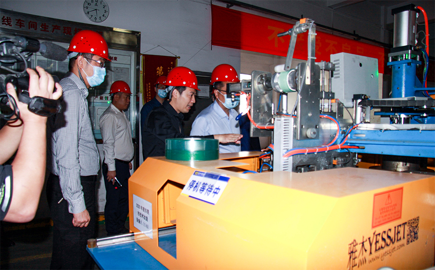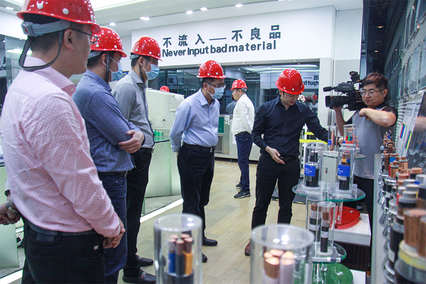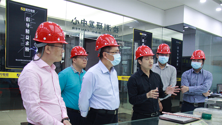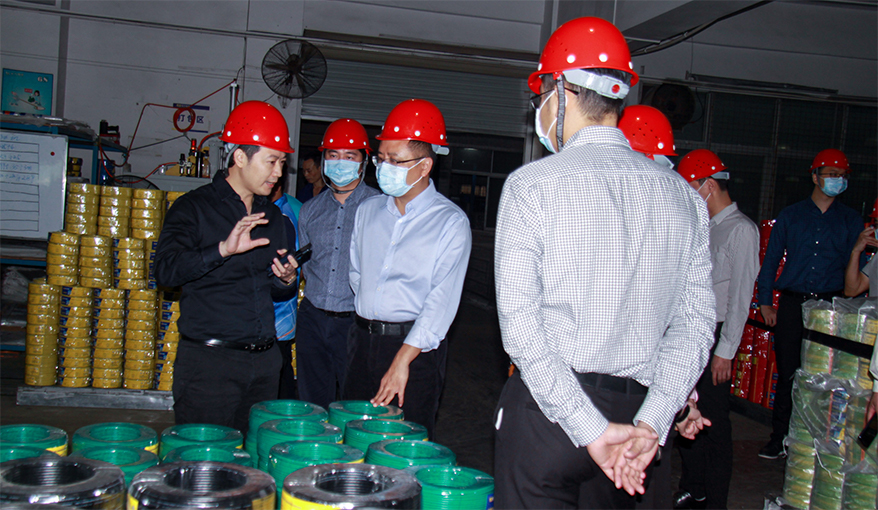 隨后,一行人又分別走訪了拉絲生產車間、檢測研發中心、交聯機生產車間等。調研中,楊總詳細匯報了企業在疫情影響之下努力克服不利因素,全力以赴抓生產經營,促進企業安全生產等方面所做的工作;同時介紹了VR彩票最新研發的礦物絕緣防火電纜新品、生產技術、功能特性及市場前景等。